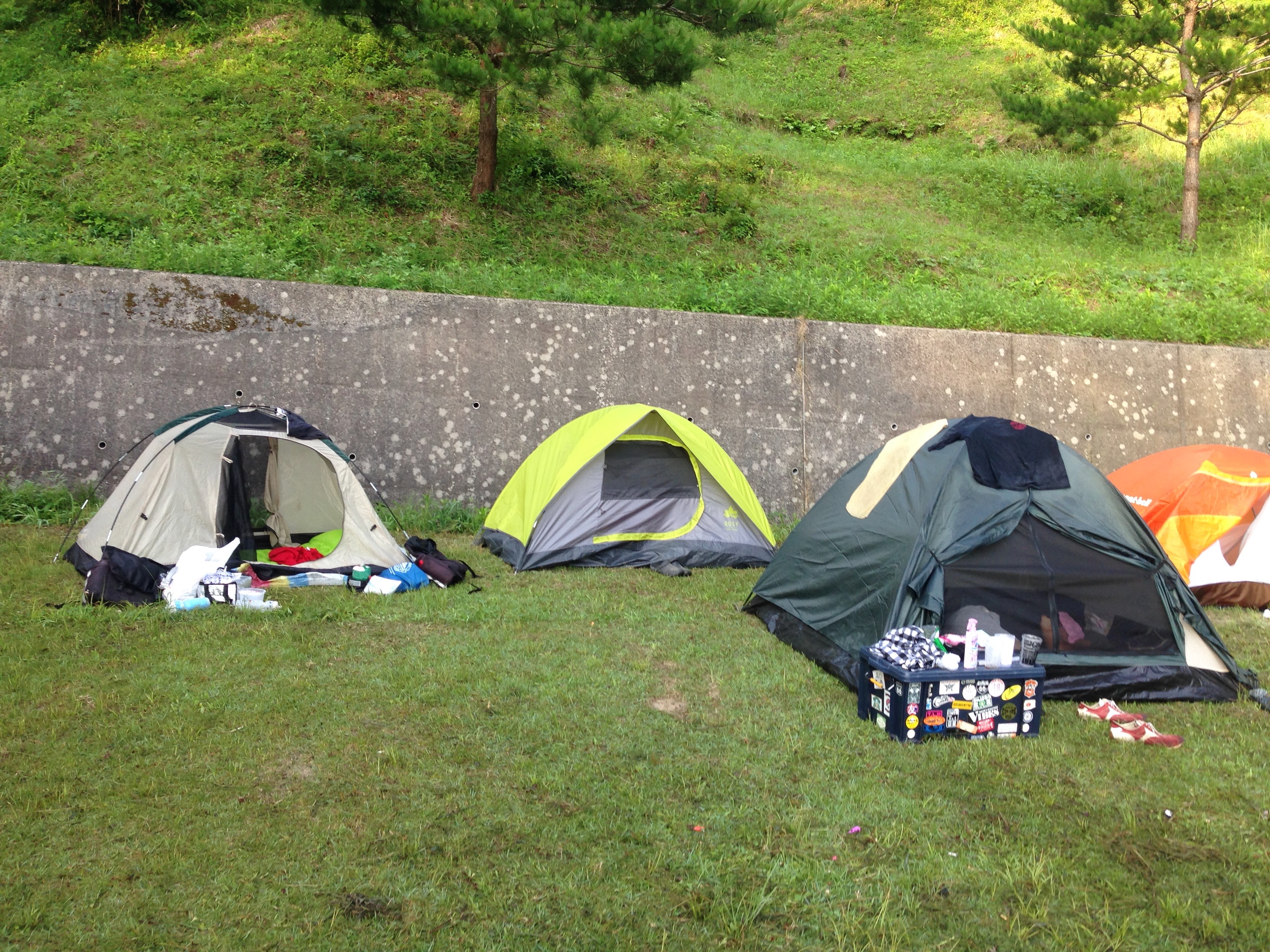 Yasuragi no Mori Campground where I stay the second night was a typical Japanese auto camping site. Meant for picnickers and people rode in a car for just a couple hours to get there. No showers. But plenty of water for cooking and washing gear at the outdoor concrete water trough. I didn’t have a reservation for this campground either. I knew in advance that a large group had reserved it in advance but I went anyway. I reasoned that even if I couldn’t stay in the campground proper I would be able to stealth camp nearby. After seeing the area I think I could have found a place but as luck would have it the kanrinin was not at all concerned about the group that had reserved the whole campground and neither were the people that reserved it. They didn’t mind if I squeezed my little tent in. For most of the campers, the foreigner on the bicycle was just a curiosity blip on an already fun weekend with friends. As usual there is always someone who tries real hard to speak English with me but is always relieved when they discover I speak Japanese. I had a nice conversation with a youngish fellow named Yoshi. He gave me 2 cans of beer which I drank in addition to the one I had bought at a nearby convenience store. I like meeting him though at times the conversation was a bit awkward. Meeting people along the way is part of journey.