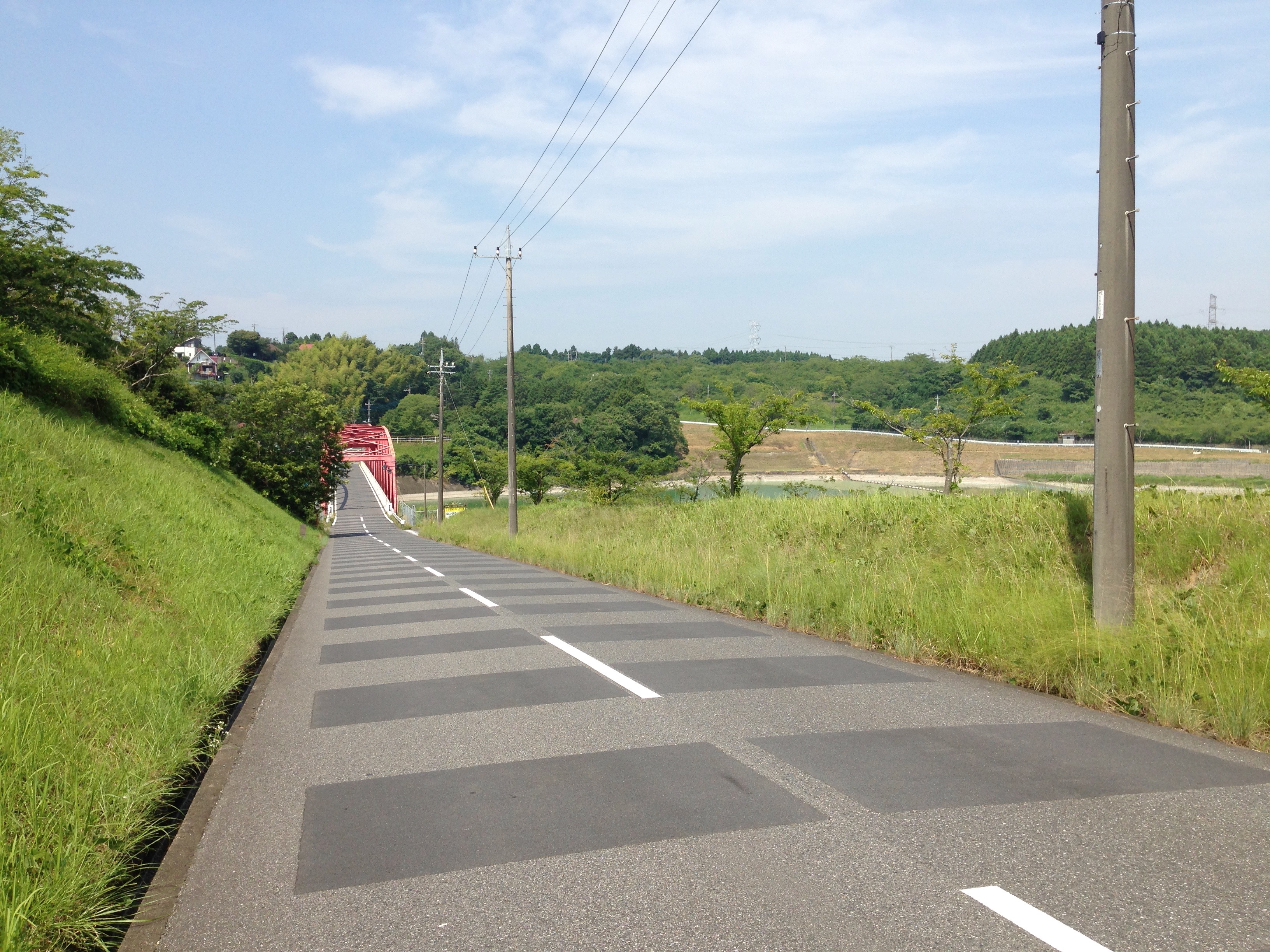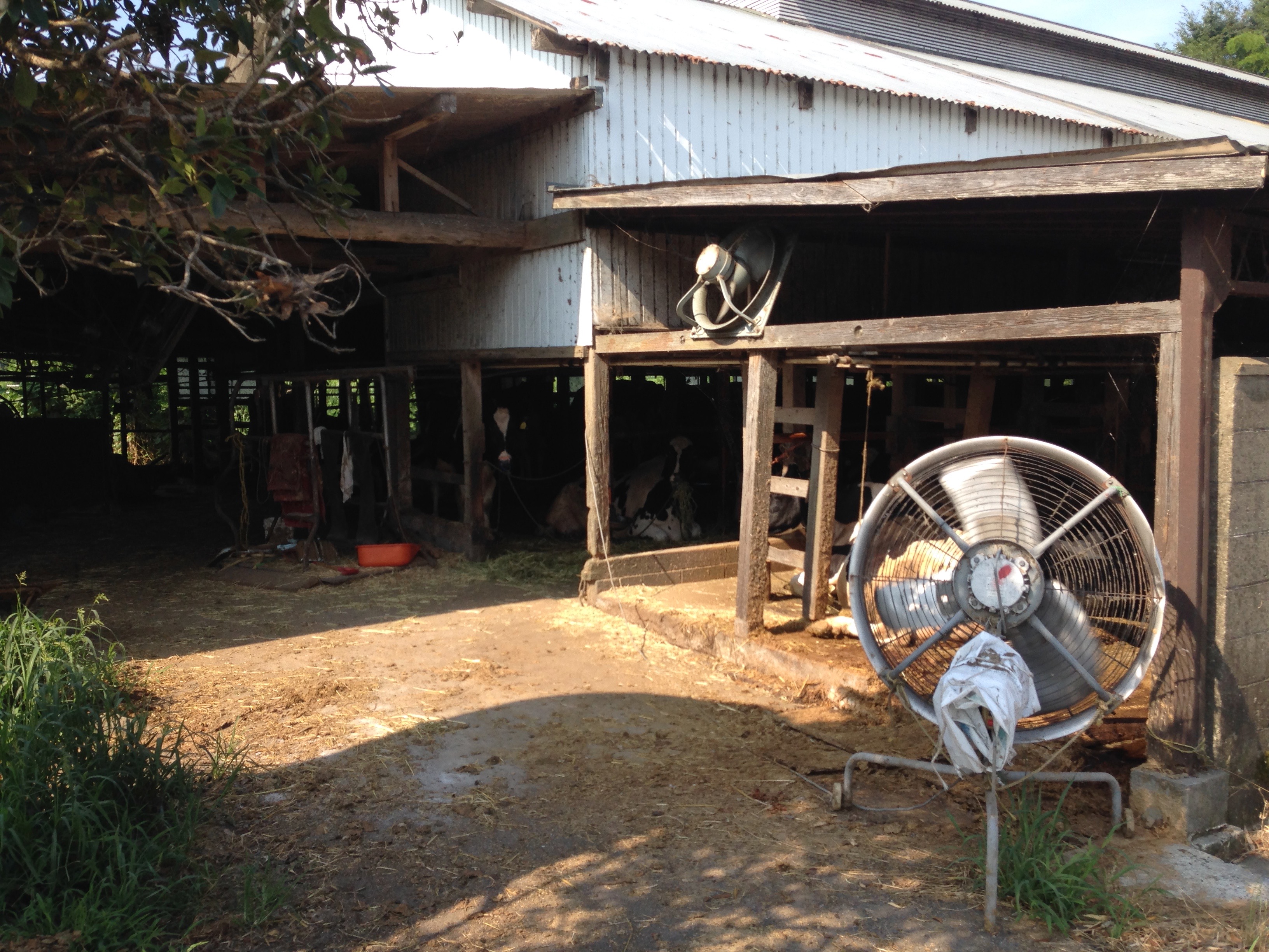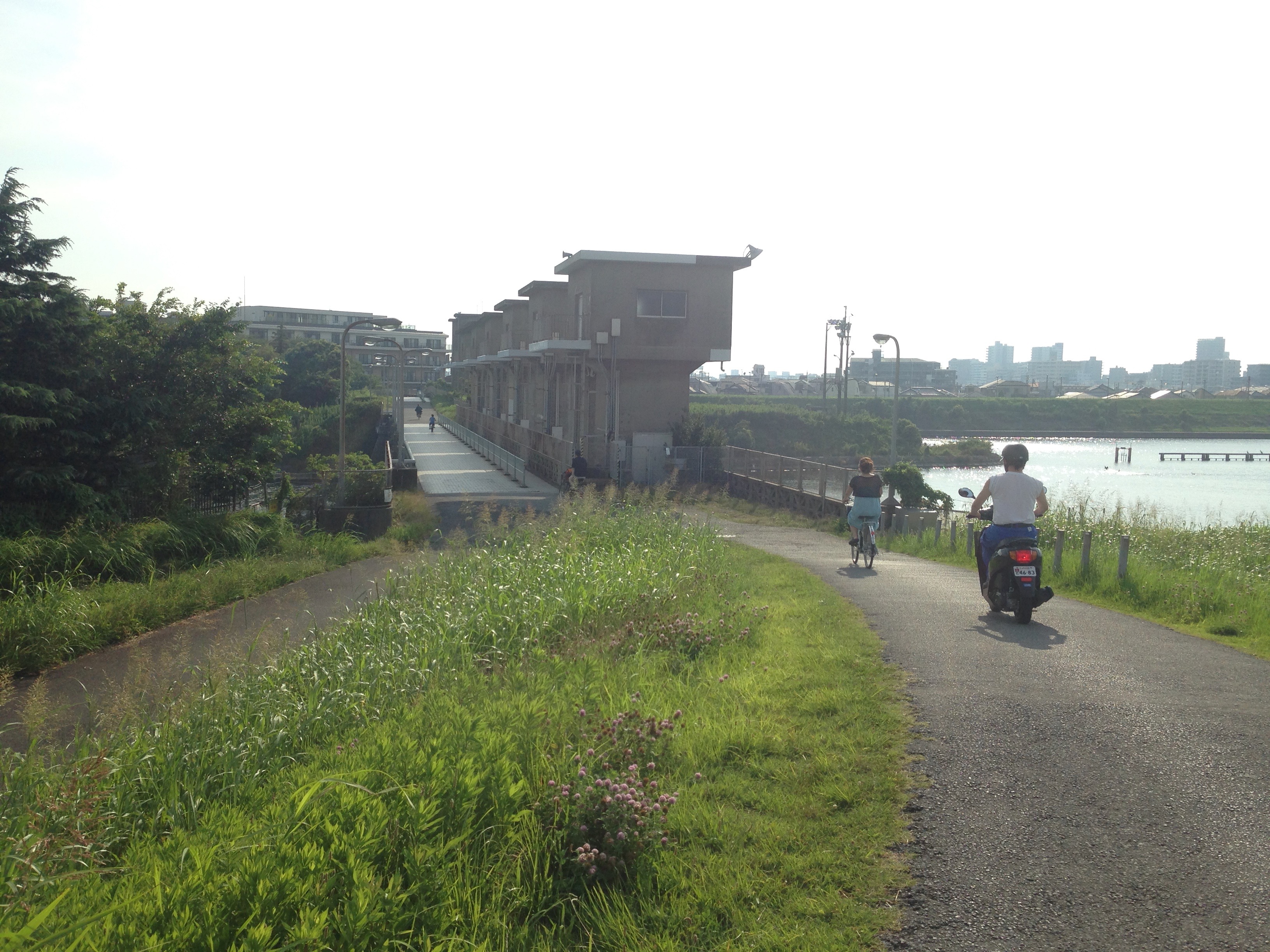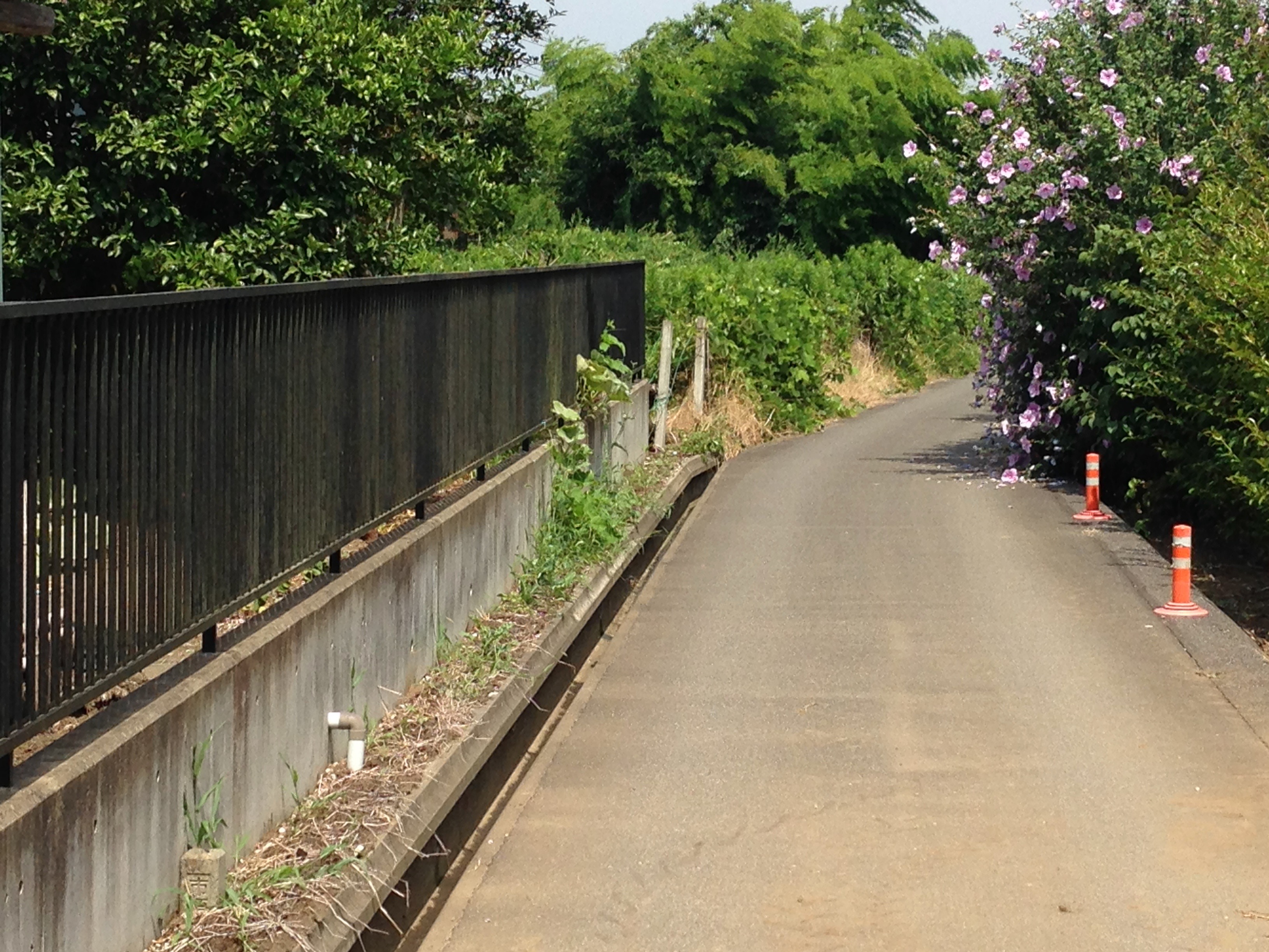 I think there are three highlights from the third and last day of the trip. The first was the back alley that took me by the hollyhock bushes. I really like hollyhocks. They always remind me of my great grandma. There are hollyhocks on my commute to work as well and lately I have been thinking about planting some in my yard. The highlight was the park in what I believe is Narashino. The trail on the edge of the park paralleled the road and gave me some much needed respite from the sun. The trees also deadened some of the noise from the nearby busy highway. The only downside was the park was segmented every kilometer or so by a cross road which could only be crossed by pushing my bike over the pedestrian overpasses. This is in the video if you haven’t seen it already. The interruption made it hard to maintain a steady pace. The third thing that really turned my cranks on the final day was passing the farm where the cows were being cooled by large fans. They smelled just like…well they smelled like cow manure which I found was a refreshing change from the ordinary city stinks that I experience from day to day. The smell reminded me of living in Wisconsin when I was a kid.