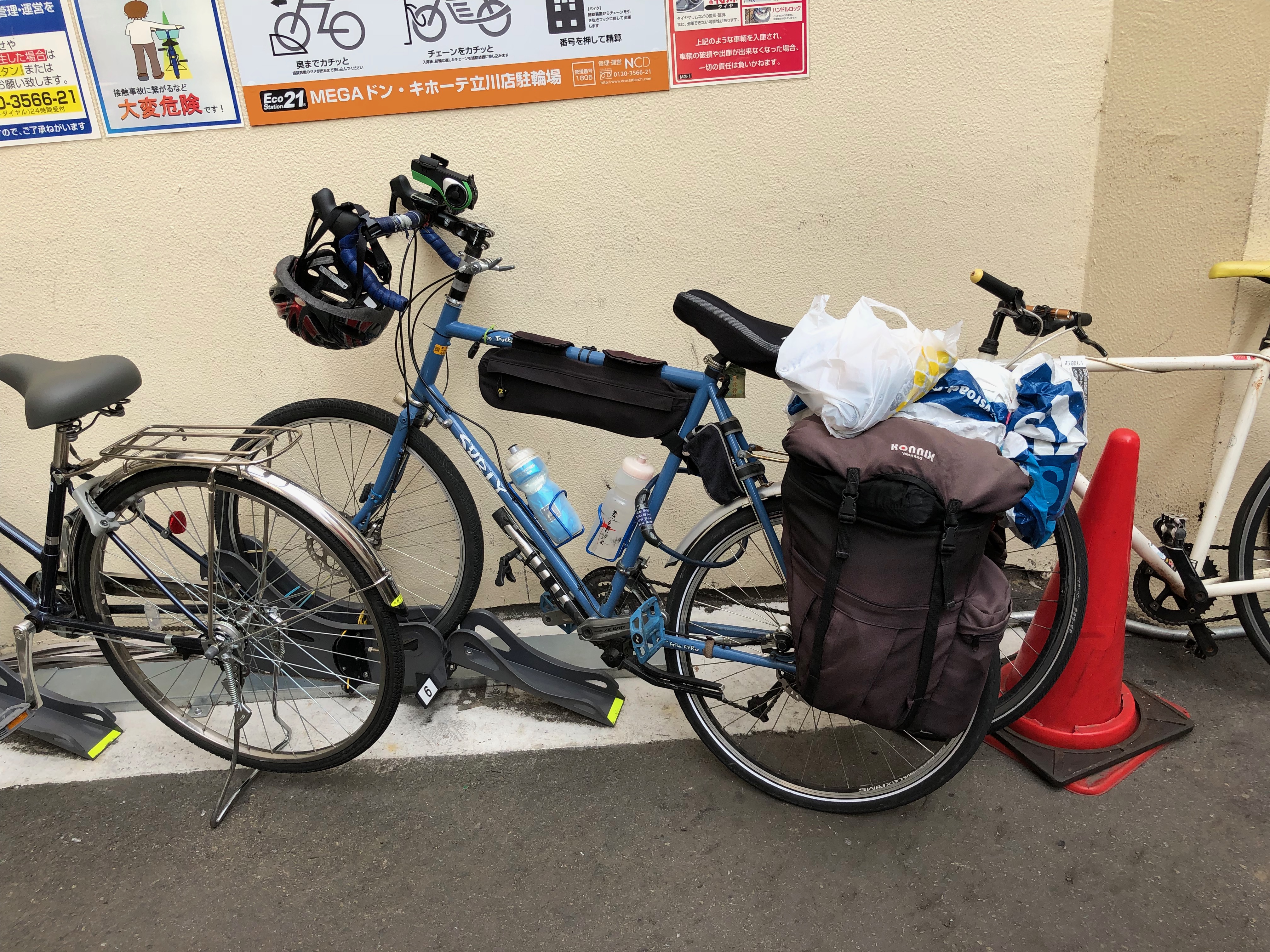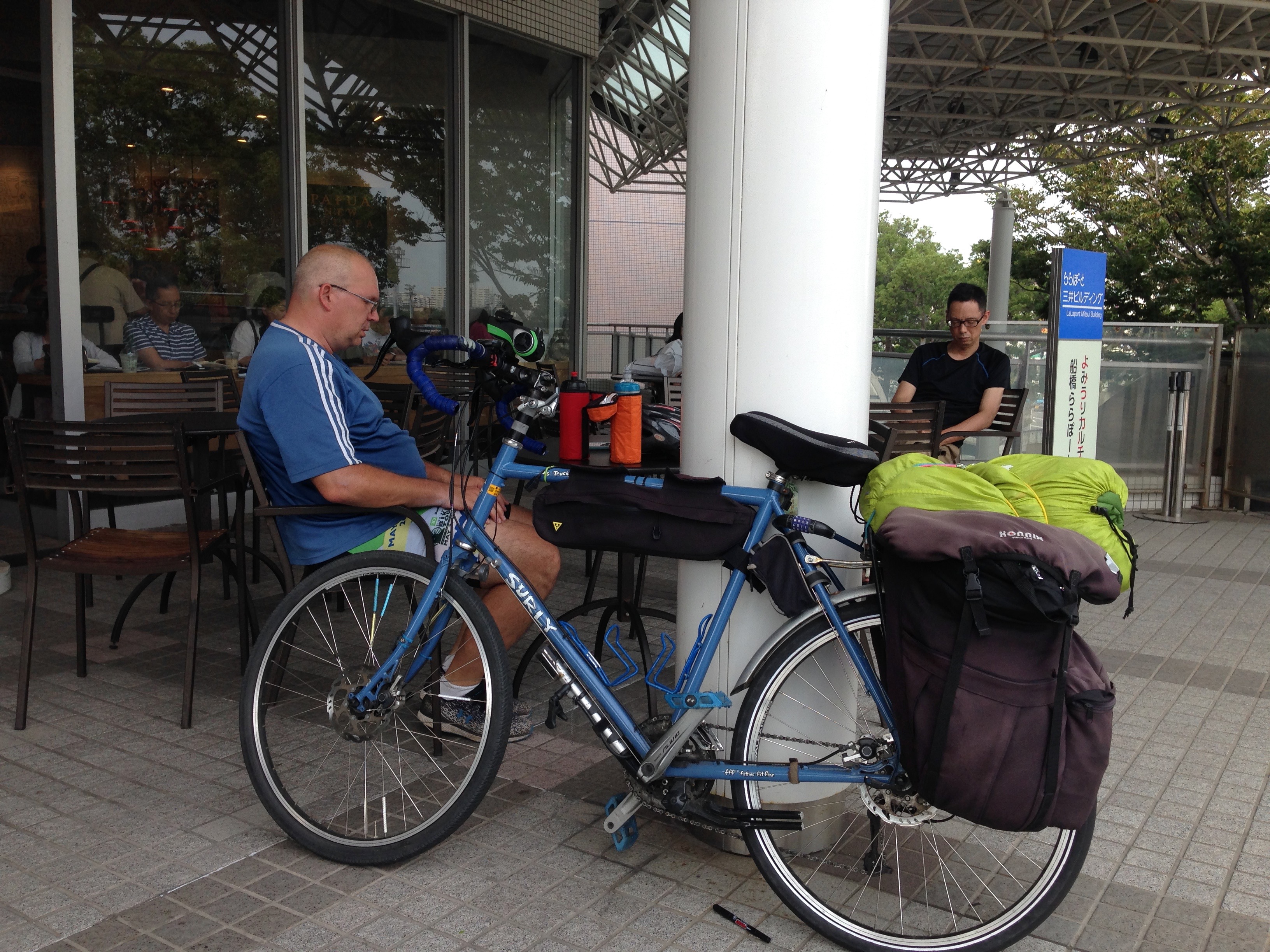 Of course, low point of the day may have been the puncture I got somewhere on the outskirts of Chiba City. I was amazed at how deep the screw worked its way into my tire and how I didn’t really lose air until I wiggled it back and forth. I tried to take video of the whole tire change scene but my camera was full up and I only captured the very beginning. I will have a follow video about the whole tire situation coming soon. What I will say is that I patched the tire and put back onto the rim but air leaked out right away. I thought I had screwed up the patch job. I was too hot and sweaty to hang around a parking lot with my tools and some of my gear scattered around me so I just took the tire off again and put my spare tube on instead. If I had investigated further I would have found the second hole that screw had made in my tube. Now that I know about it, I am even more impressed by how well the tube and tire held up. Schwalbe really makes great tires even when you choose a less optimal model. Check out the upcoming follow-up video for more about my love affair with Schwalbe tires.