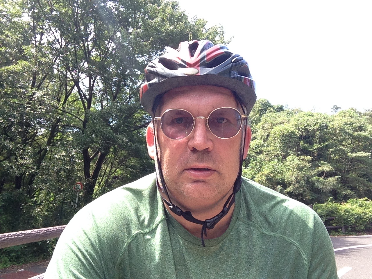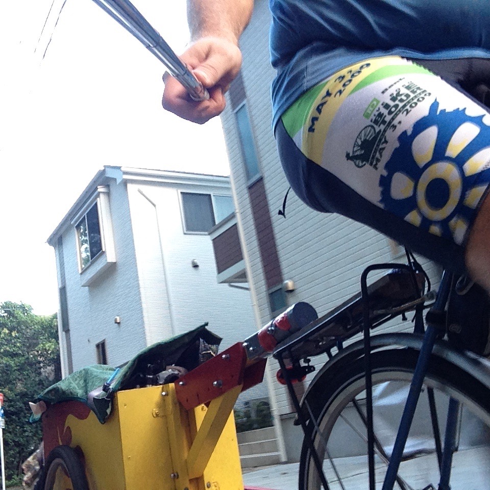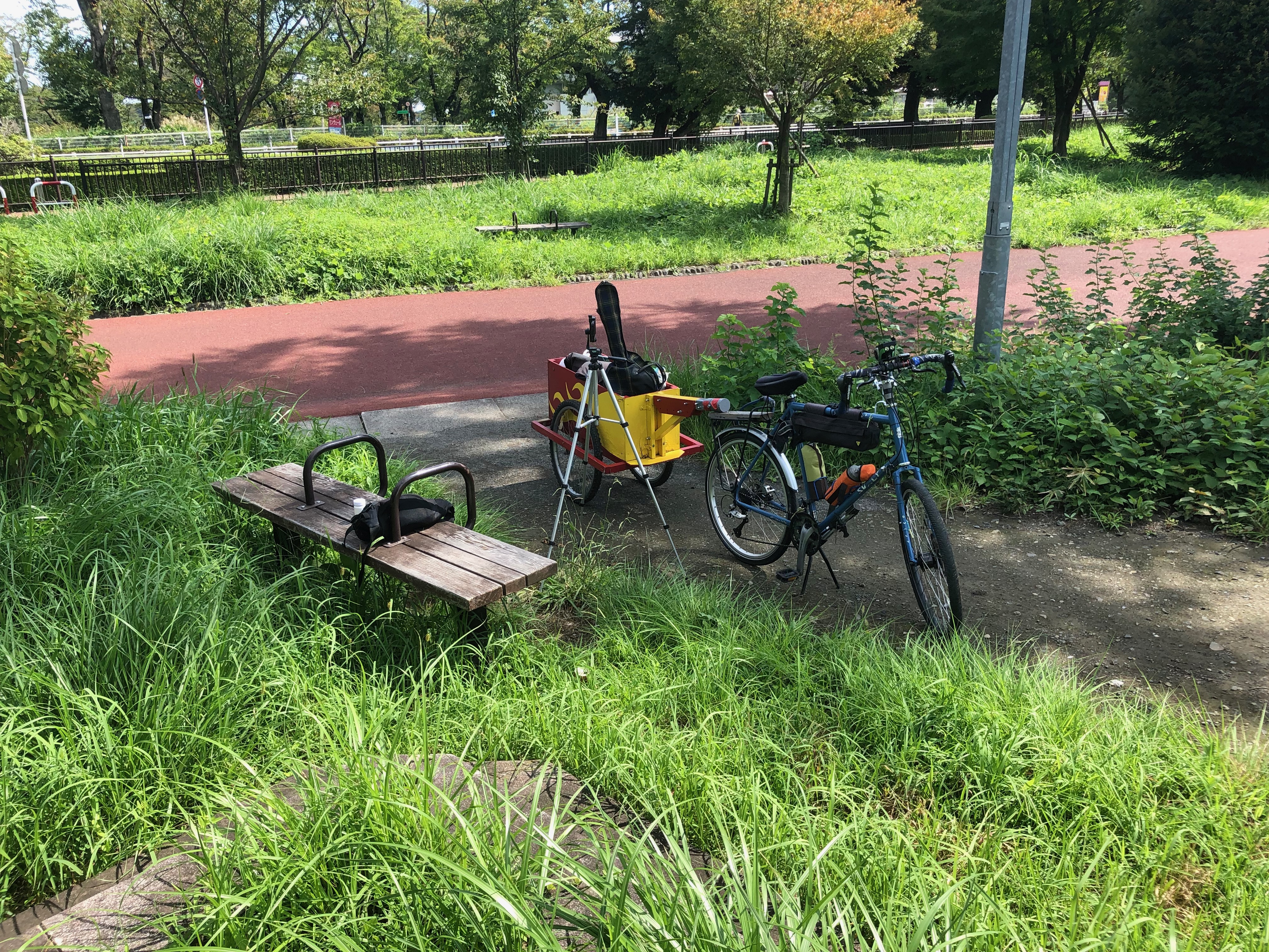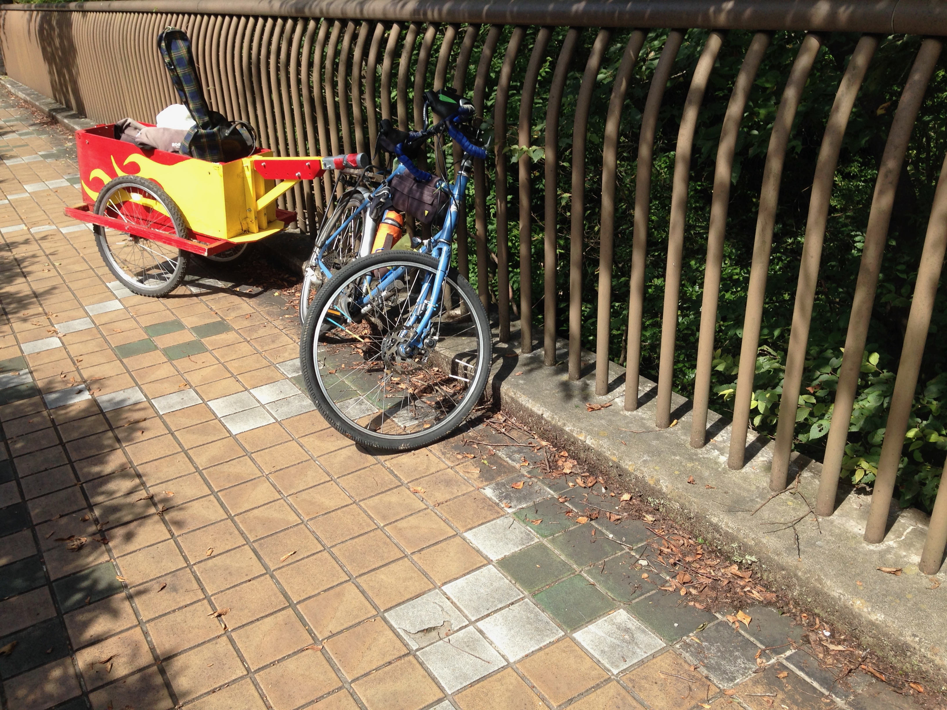 The weather was perfect for cycling. Not too hot, not too cold. I followed the bike path around Lake Tama. This bike path is one of my favorite places to ride. On one side you have the woods that surround Lake Tama and Lake Sayama like a green bathrobe and on the side of the path you have a sparsely travelled road (by Tokyo standards) that cuts through intermittent parks, woodlands and an occasional manmade structure like a shrine or baseball stadium. The trail is almost always in the shade and it has the right amount of up and down to make is a fun ride without being too strenuous. I hid some geocaches to replace ones that had disappeared and checked on others that I had placed. All the while, the Draggin’ Wagon was tracking along nicely behind me.