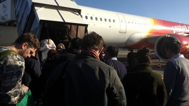 The airline for this trip is Viet Jet Air. A budget airline for sure. The Viet Jet Air gate didn’t service the really big jumbo jets. The planes don’t taxi all the way to the gate. You have to take a shuttle bus from the gate to where it is parked out on the tarmac. A new experience for me. Even smaller jets seem really large when you are on the ground level looking up at them.