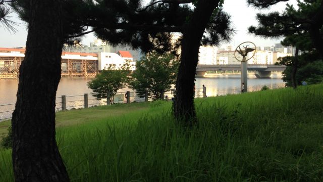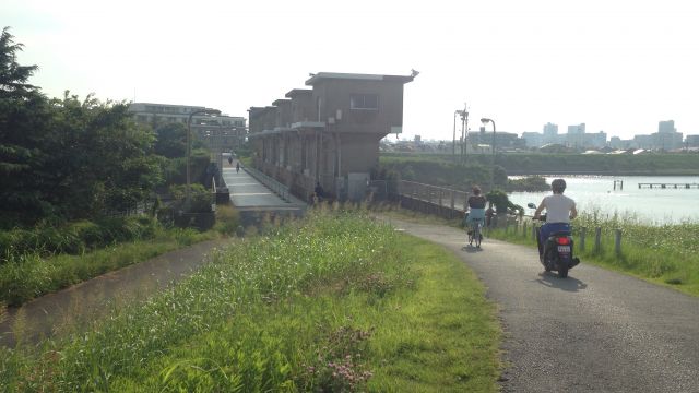 I think there are three highlights from the third and last day of the trip. The first was the back alley that took me by the hollyhock bushes. I really like hollyhocks. They always remind me of my great grandma. There are hollyhocks on my commute to work as well and lately I have been thinking about planting some in my yard. The highlight was the park in what I believe is Narashino. The trail on the edge of the park paralleled the road and gave me some much needed respite from the sun. The trees also deadened some of the noise from the nearby busy highway. The only downside was the park was segmented every kilometer or so by a cross road which could only be crossed by pushing my bike over the pedestrian overpasses. This is in the video if you haven’t seen it already. The interruption made it hard to maintain a steady pace. The third thing that really turned my cranks on the final day was passing the farm where the cows were being cooled by large fans. They smelled just like…well they smelled like cow manure which I found was a refreshing change from the ordinary city stinks that I experience from day to day. The smell reminded me of living in Wisconsin when I was a kid.